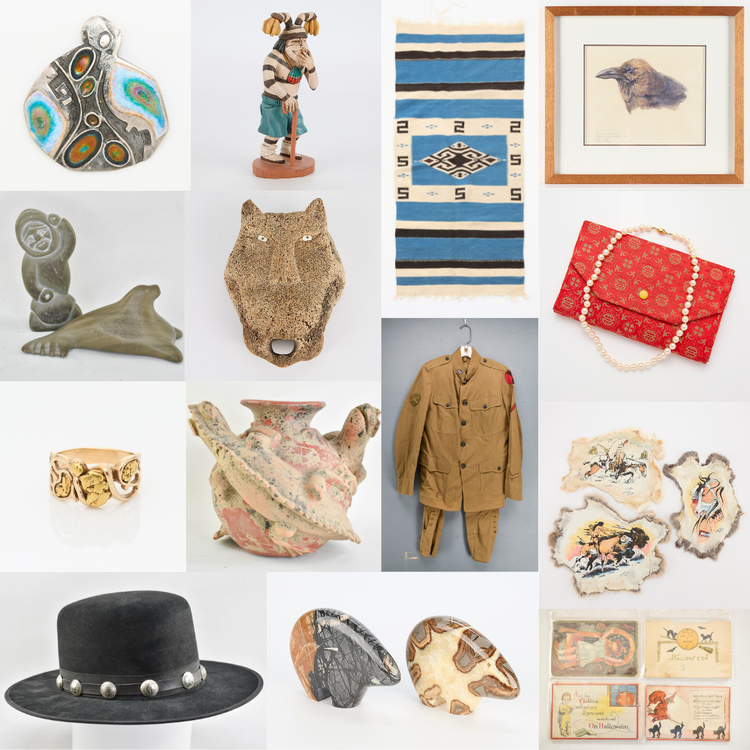 With over 900 lots, this terrific auction includes art and artifacts made by Native American, First Nations, and other Indigenous artists including Navajo, Hopi, and other peoples. It features a large collection of southwestern, modernist and traditional jewelry. A variety of Western cowboy clothing and accessories; paintings and prints of wildlife, landscapes, and more. Featured lots of rare military uniforms and collectibles, as well as, assorted antiques and collectibles, including advertising, sculptures, and more; large stamp and postcard collections.